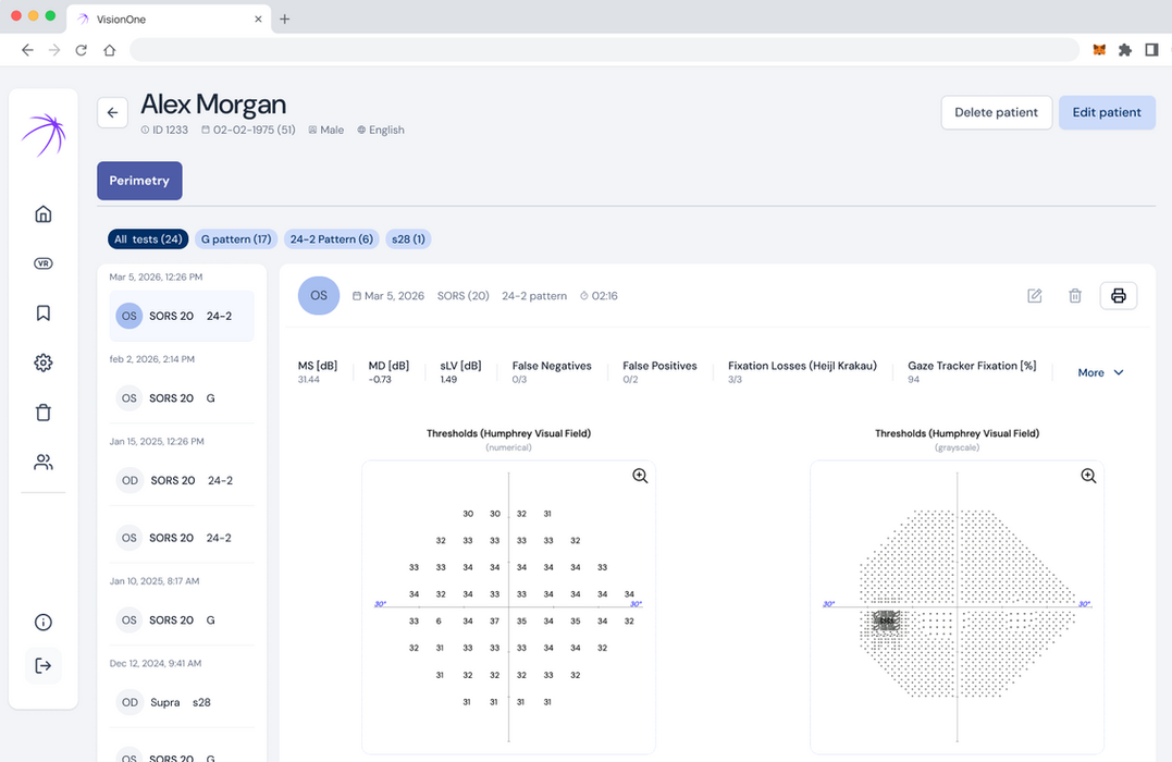 For ophthalmologists and optometrists specialized in glaucoma, VisionOne™ is the VR visual field platform with industry-leading speed and accuracy. We combine patented AI, Swiss engineering, and international clinical validation to deliver highly reliable results and strong correlation to the gold standard.